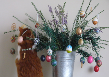 Now, he thinks our Easter Egg Tree is his new toy. (Remember the debacle with the Christmas tree?) I am working with him on this, not to bat at the eggs. So far, not so good: