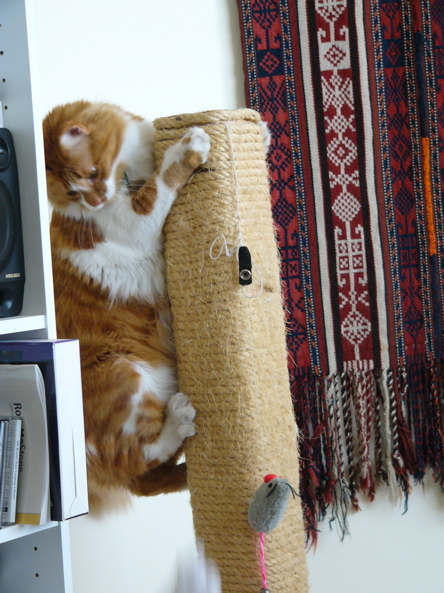 But sometimes, when he needs exercise, we tease him. We put his white bear “baby” at the top of his scratching post: