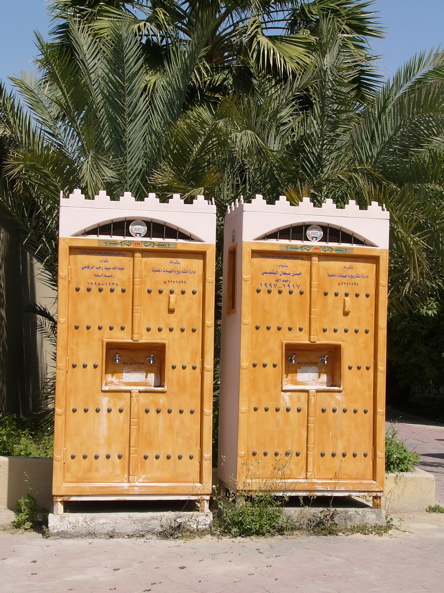In Kuwait, and other Gulf countries, religious individuals, mosques and cities provide drinking and washing water as a courtesy to the public. You will find water stations everywhere, and people filling up their bottles for drinking later or drinking from a tin cup attatched to the sabille by a chain. They come in all shapes and sizes. When we spot a new shape, we try to get a photo. This one is a very common shape: