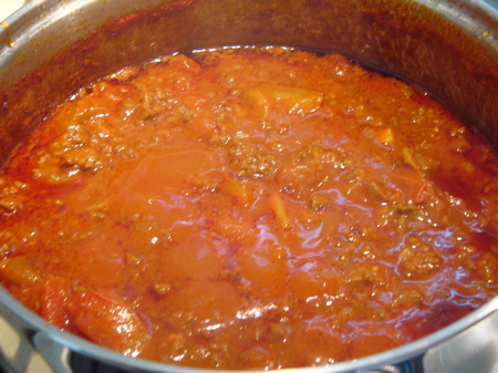 Over low heat, cook the spaghetti meat sauce for hours – maybe three – until it has become less soupy and more sauc-y.