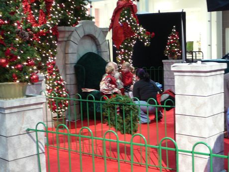 It’s time for that old tradition, sitting on Santa’s lap for the annual Christmas card. It’s funny, you warn your kid about strangers, and then once a year you stand in line waiting, and then plop your kid on this total stranger’s lap and expect him/her to smile for the camera. And some of those Santas are very scary looking! This one had a kindly look, and I didn’t hear any of the kids screaming. 😉