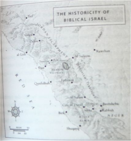 Here is a (very bad) photo of the map in the book which shows where Salibi believes the biblical cities were actually located. He believes “Jerusalem” was not a city, but an area within which were several cities. He believes “the Jordan” was not a river, but a mountain range, and that here, also, Moses and his refugees from Egypt wandered.