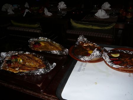 The kitchen at Al Muhaleb is glassed in. We spot our fish coming out of the oven, and oh, it looks magnificent. As good as it looks, it tastes even better: