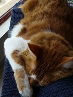 The Qatteri Cat loves to find new places to slumber down. Today he is on the back of one of the loveseats, literally sinking as he sleeps. I am watching to see how far he will sink before he will rouse himself and get out of the crevice.