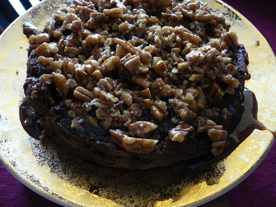 For the icing: Just before the cake is done, combine butter, milk, and brown sugar in a saucepan, bring it to a boil and boil for one minute. Add the pecans and mix. Spread over cake.