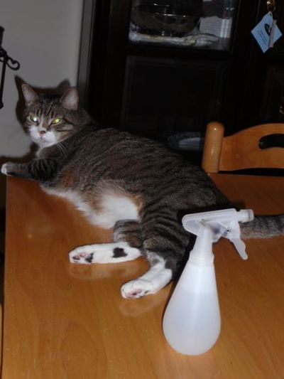 Our son has a cat. Our son has a sprayer. The cat gets on the table, where he knows he is not supposed to be. Our son yells “Gordon! Get off the table!” and Gordon settles down. Our son jumps up and gets the sprayer, and Gordon watches. Our son sprays. And sprays. And sprays. If you get right up close to Gordon and spray under his tail, he will get up slowly, annoyed, and saunter off the table. He takes his time. He wants you to know you are annoying, but you don’t scare him. He wants you to know that you are NOT the boss of him.