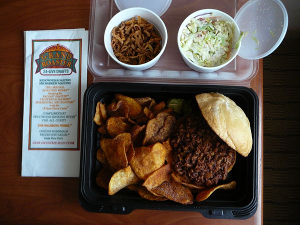You put the cole slaw and the fried onions on top of the BBQ meat there – it already has a Kansas City mustardy sauce cooked right into it. . . oh YUMMMMM. And just look at those chips! Real potato! And SO crisp!