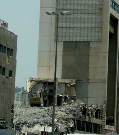 Nowhere else have I seen bulldozers up in buildings. I can’t imagine the building being destroyed was constructed with specifications supporting the weight of a bulldozer in mind. I can’t imagine what the bulldozer operator must have in terms of life insurance – or, well, too bad, I can imagine he considers himself lucky to have a job that allows him to send some money back home. At least this bulldozer is only three stories above ground – the last one I saw was eight stories above ground. And the driver didn’t even have a construction helmet on.