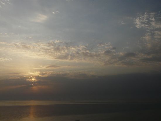 More clouds! Beautiful Tiepolo clouds! A Turner sunrise! And look, you can see almost all the way to the horizon. That nasty yellow-black band of (whatever it is) that hangs over the horizon on some days is gone!