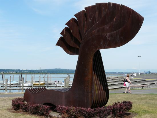 I love it because it looks like a whale, playing in the surf. It is made of like seven different slices of (wood?) (metal) bolted together, so that if you look from one end, all you see is flat slices, but the sculpture seems to move as you move around it. So creative!