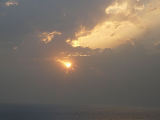 This is the sun just beginning penetrate the low laying clouds on the horizon: