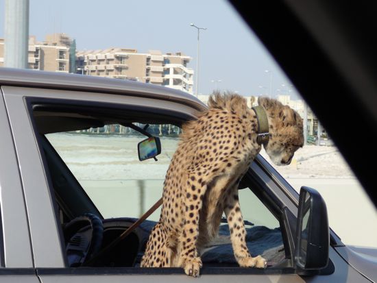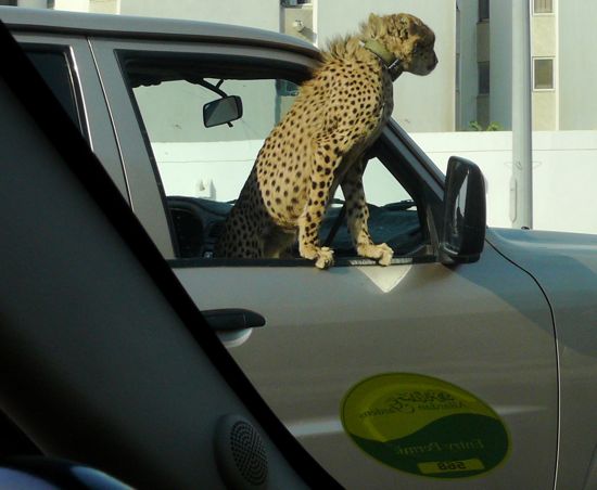 The man with the very young cheetah on a leash under very loose control was having a ball. The cheetah looked very happy to be out in the car with him, even on a leash.