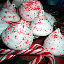 2. In a large glass or metal mixing bowl, beat egg whites, salt, and cream of tartar to soft peaks. Gradually add sugar, continuing to beat until whites form stiff peaks. Drop by spoonfuls 1 inch apart on the prepared cookie sheets. Sprinkle crushed peppermint candy over the cookies.
