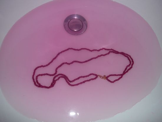 The rubies in these necklaces are not the high quality kind, just rubies, rough cut. I guess they must have thought I wouldn’t like it unless it were really bright ruby red . . . it took nine washes before it stopped bleeding red. I am hoping it was the dye I was allergic to – I’m still afraid to put the necklace on, afraid I will get big red welts again.
