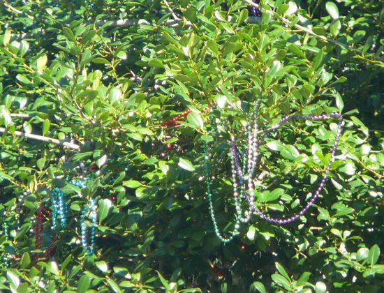 Today I needed to do a couple trips downtown and so I looked closely at all the colorful objects sparkling in the trees after the Mardi Gras parades. Yep. He was right. Beads.