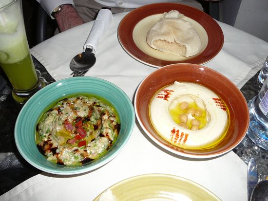 We started with hummus and baba ghannoush, served with hot hot bread: