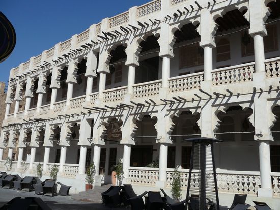 If you are parking in the parking lot on the upside of the long restaurant street, near the Beirut, near Dhow roundabout, and you look at the souks, there is a whole area down on the left that is being developed. There is a large interior souk with abayas and scarves, for example, and a man with the model tents that they will make for you.