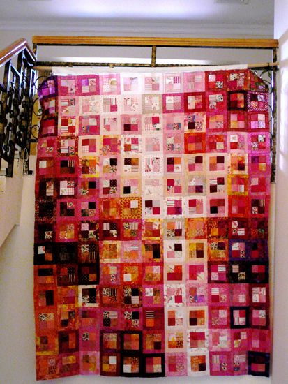 About a year ago, when I first moved back to Doha, I decided to use up a bunch of pink scraps that had collected over the years – baby girl quilts, friend quilts – pink isn’t my favorite color, but I hate waste. I chose a pattern I thought would be easy, but then . . . I started playing. I always associate pink with Barbie, you know, that Pepto-Bismo pink? Bubble-gum pink? And then I thought “What if Barbie got an edge? What would Barbie look like in real life, the light innocent pinks of girlhood? The hot passion of teen-age crushes? The elegant reds of romance and the purples of betrayal? What would she look like when menopause hits?”