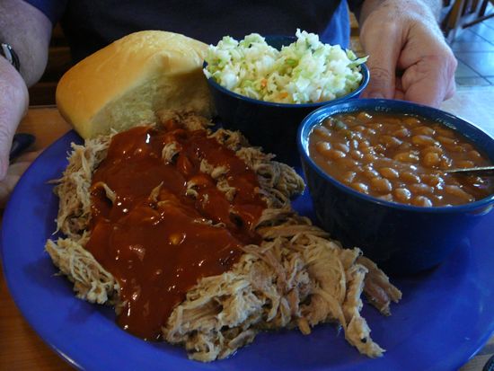 AdventureMan had to try the pulled pork platter, and for his two sides, he chose the sweet and sour slaw and the baked beans (the two sides we think are critical to truly good BBQ, although we sometimes try other things, if the slaw and beans aren’t right, it isn’t BBQ). His platter was enormous, and delicious:
