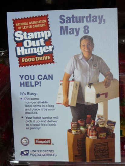 This week, on Saturday, the mail carriers sponsored a food drive for the local food pantry. Early in the week, they delivered flyers and a sack to each house on their route, asking us for donations of food to be placed on the doorsteps on Saturday. They even mentioned foods and items most needed, so it was easy.