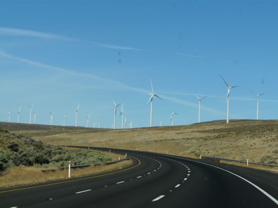 Leaving Spokane, the scenery changes again, back to warm and toasty, with lakes and windmill farms: