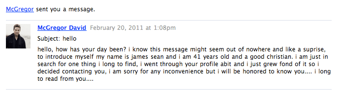 So, ‘McGregor’, what has you longing to ‘read’ from me? What part of my profile appealed to you? The part where it clearly states I am MARRIED? You being a good Christian, that must have a lot of appeal.