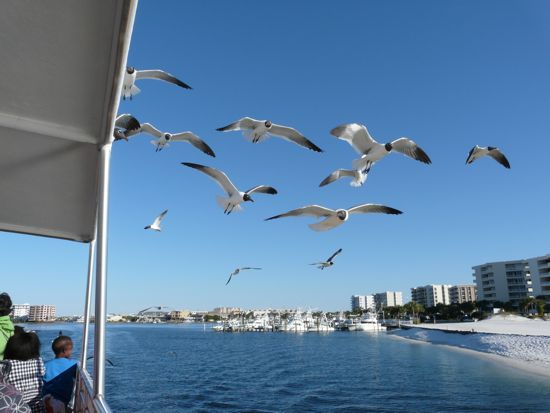 We hit the SanDestin Outlet Malls, big mistake, they had hoardes of shoppers and people lining up with numbers to get into some of the most popular shops (shudder!) so we toodled around and got back to the dock in time for the sunset cruise. The boat had a good load, but was not too crowded, and we had perfect, beautiful weather. Here are some photos: