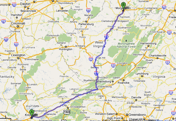 It’s quirky. There was actually another way, a way that did not take us through the University of West Virginia (!) and past the hospital entrance and through the parking lot (!) but it got us there, relatively directly, and it was a total hoot getting there.