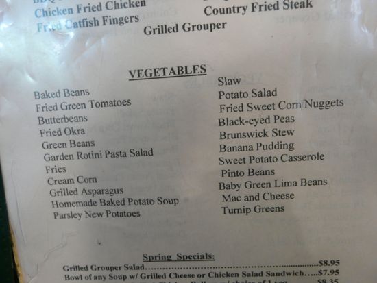 AdventureMan had ‘vegetables.’ For strict vegetarians, warning: ‘vegetables’ in The South often contain shreds of meat, and meat fat, usually pork: