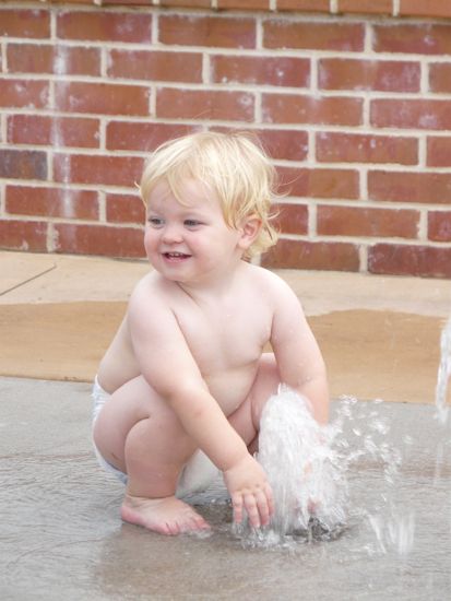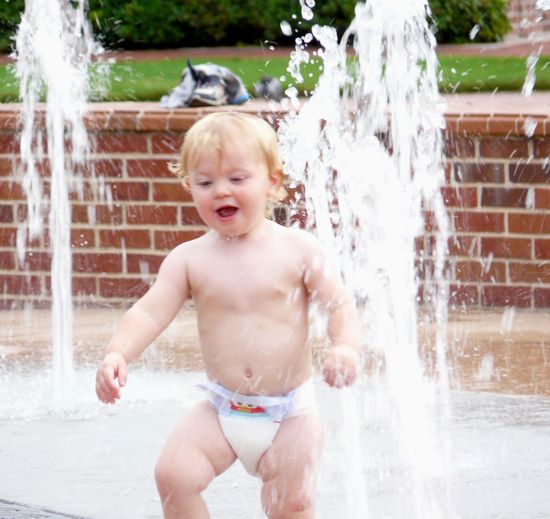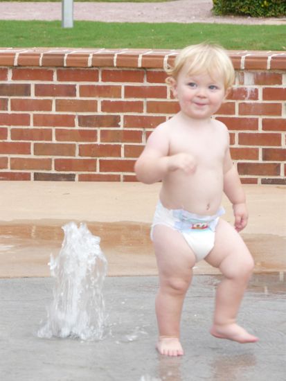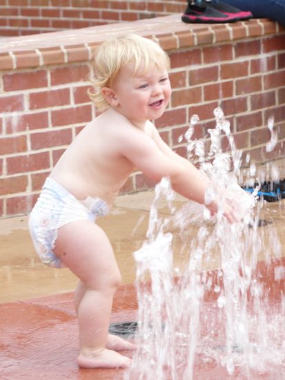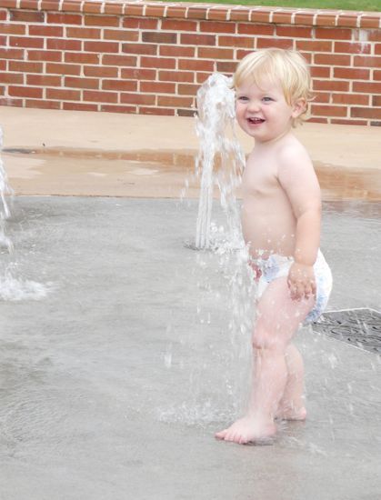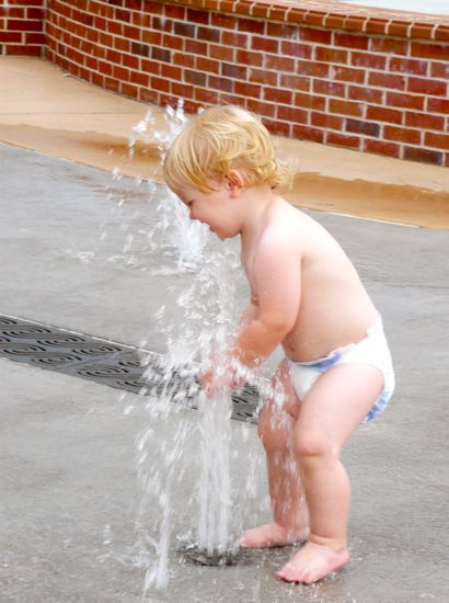 In Pensacola, there is a wonderful fountain at the foot of Palofox, at the turnaround, and it is the perfect place for a toddler on a steamy day. They have all kinds of spurts of water coming up. The water changes height and force, so it is full of surprises for the young ones.