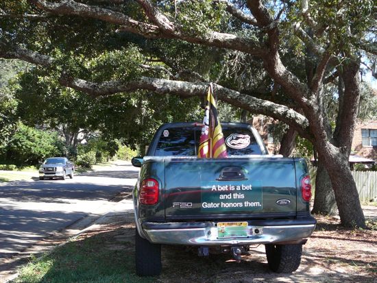 So you have to laugh when you see a good sport like this. I don’t know what the bet is, but it has to hurt to be sporting a huge Florida State flag for an indeterminate length of time (we’ve been seeing this truck for a couple months now.)
