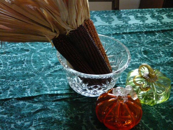 And here it is, with the little green pumpkin I bought last year, on my beautiful green Damascus tablecloth in the dining room: