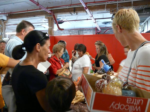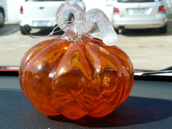 BIG mistake. No parking spots, so AM let me off to fight the crowds while he looked for a parking spot. There had been a huge line; none left as I get close to the door, but inside, it is a frenzy and it is a turgid stream of people. Many are carrying boxes and people are grabbing at pumpkins, beautiful glass pumpkins of all colors, but I knew I wanted a big orange pumpkin. I only found one orange pumpkin, a small pumpkin, but I never did see a big pumpkin, so this one will have to do.