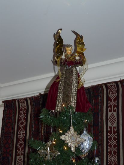 Our tree this year is smaller – and higher – that other years, and all the ornaments on it are unbreakable. Yes. Happy Baby, now Happy Toddler, will be coming by and I want to protect him – and the tree. Over the years we have collected so many wonderful ornaments that I have a lot to work with, and still manage to have a nice tree; the angel on the top is a traditional angel from Nurnberg, and we bought it the first year we were married. It’s nice to have her high on the top of the tree once more.