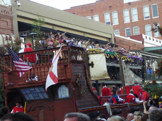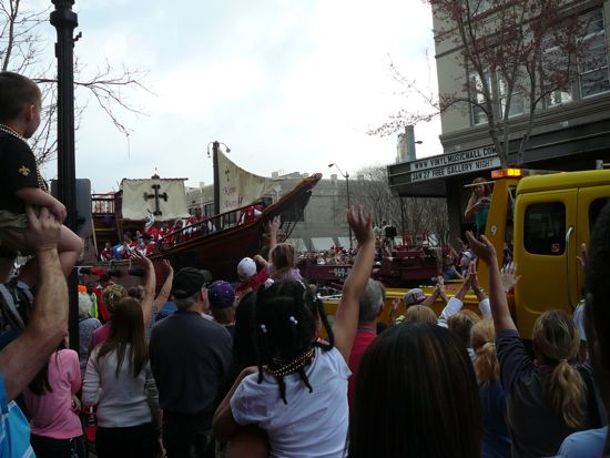 This parade was hilarious. First, it was a daytime parade, and most of the parades I have been to in Pensacola have been night parades. There were like fourteen marching bands and many floats, so it was LOUD! The Happy Toddler would have loved it. Lastly, they were generous with the beads, people were loaded with beads, and some of the beads were special!