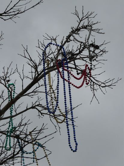 We had almost a full week of grim, grey skies and little sunshine, during which I saw the sad reminders of Mardi Gras valiantly trying to sparkle in the trees: