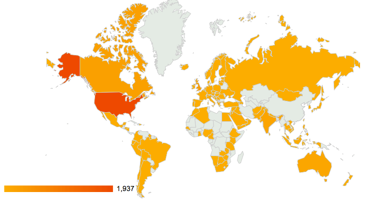 When I went to my Stat page today, I found a new presentation – the countries my visitors are from, listed and in color codes on a map: