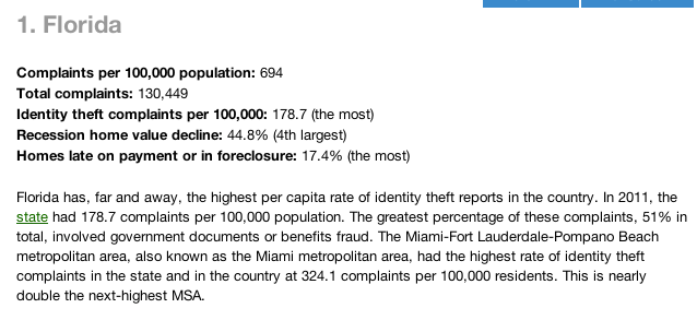 I bet the high rate of identity theft/fraud is directly attributable to the high percentage of the elderly. They are the prime target of that type of fraudster.