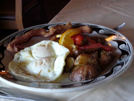 We are on the south west side of the dining room, near a large fireplace and far away from the view, but it hardly matters – the view is there, 24/7, for anyone who wants to visit. We see fabulous plates arriving at all the tables, and we watch a new wait-person being trained in the El Tovar way of doing things. It was great entertainment. Our breakfasts were divine.