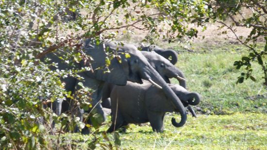 After tea, we took a boat, polling back across to the national park, where we left the car. We drive, admiring giraffe (many!) and elephant and hippo. We run into one elephant who seriously, seriously does not like us. He does several mock charges, but he doesn’t walk away, he keeps charging.