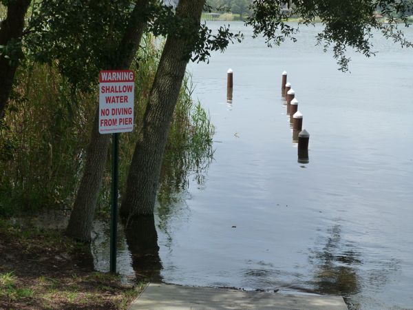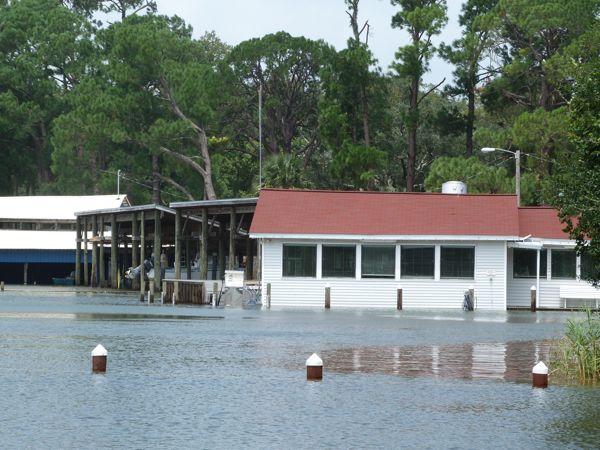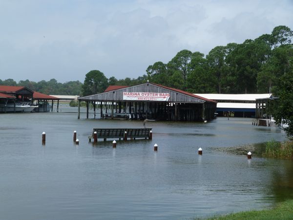 Over on Bayou Texar, you can see that the water level is very high. The piers in the park have totally disappeared, and our favorite restaurant, the Oyster Barn, is underwater – oh NO!