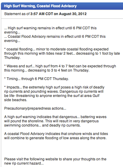 Hurricane Isaac – for Pensacola – has turned out to be not so much. Yes, there has been high water, due to the ceaseless winds pushing water onshore. Yes, there are some bursts of high winds. Yes there are some heavy showers.
