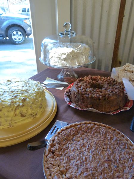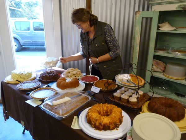 There are so many desserts that they won’t fit on one table. They won’t fit on two tables! When all the desserts are put on the tables, there are still back-up pies and cakes in the pie-safe behind the table!