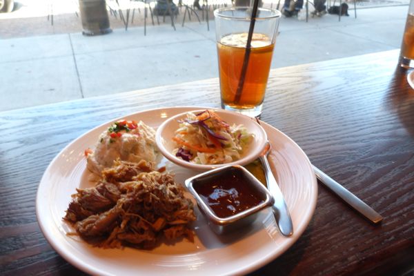In my group, we all ordered the North Carolina BBQ plate, which came with potato salad and cole slaw – all good. I loved the sauce, which had candied orange peel in it, piquant and tasty: