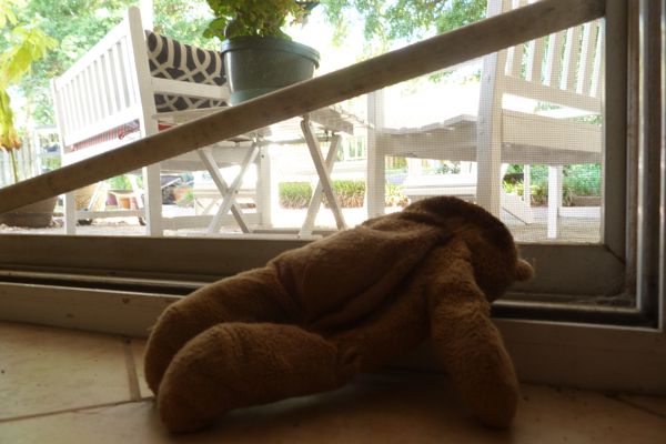 You’ve seen photos of Baby in the food dish, and Baby by the garage door. I opened the door into summer for the Qatari Cat, just the door, and propped the screen door tightly shut so QC could watch the birds and squirrels from the safety of the house.