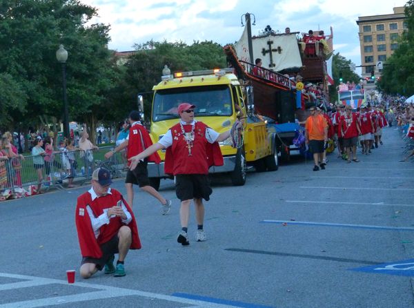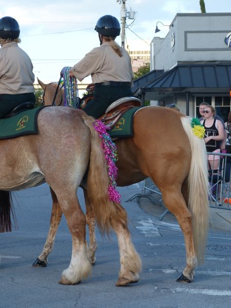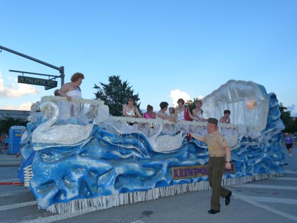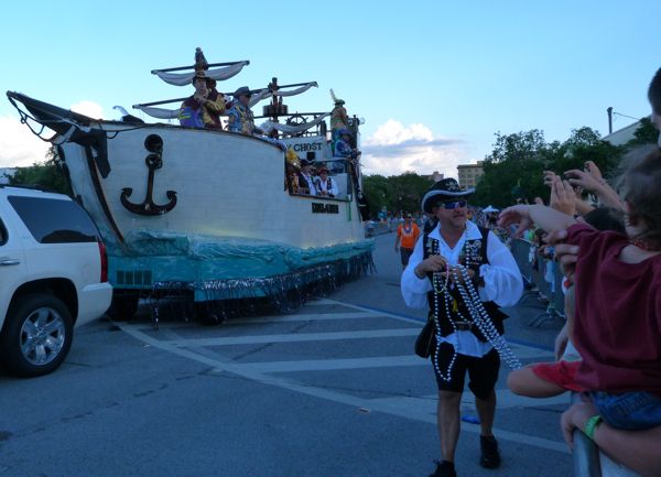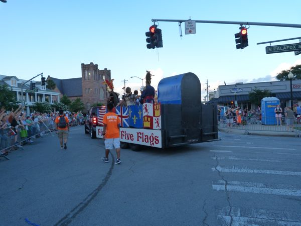 I’ve never lived anywhere with so many parades, and as Pensacola cools down a little and an offshore breeze blows away the heat of the day, a parade sounds like fun. Tonight is the Fiesta of Five Flags Parade. I can’t think of a parade since Lent, so maybe this is the kick off of the new season. Pensacola has an active and lively social scene, with all these Mardi Gras Krewes, and the older our grandson gets, the more of the parade we get to see! I think we got through three quarters of the parade tonight, and oh what fun.