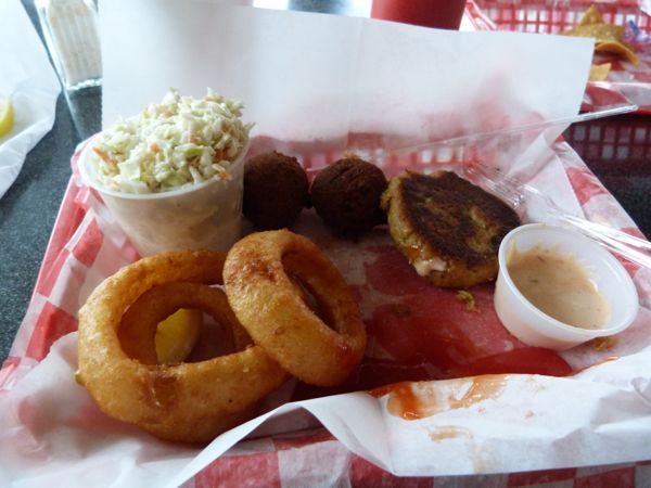 Outside Navarre, both rain and traffic began to lighten up. We stopped at a little roadside place I’d always wanted to try for something that might have been our late lunch or our early dinner – TC’s Front Porch, it’s across from the Navarre Butterfly House.