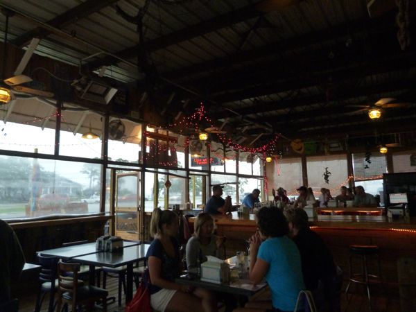 There was a small crowd inside, guys hanging out at the bar, looked like fishermen waiting for it to clear up enough to go back out and catch some fish, some tables with college kids down on the beaches for summer break, maybe lifeguards – swimming not allowed with the heavy surf and heavy rip tides running.