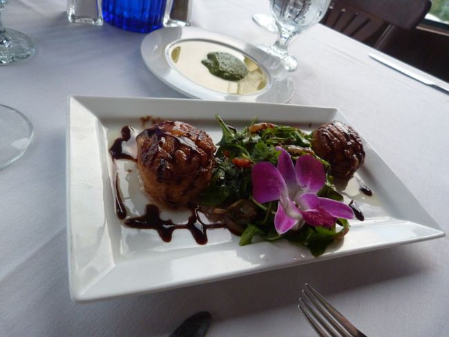 We ordered the bacon wrapped scallops first. The plate showed up with two scallops and a bed of small greens, but when we cut into the scallops – sheer heaven. They were the largest scallops I have ever seen, and one scallop was about eight bites of perfectly seared and spiced scallop. It was a divine way to start a meal.