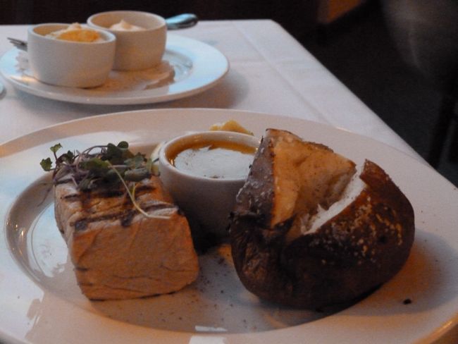And then, the main course. AdventureMan ordered off the special menu where you choose your fish, choose the preparation, choose the sauce and choose a side. His tuna arrived perfectly seared, and huge – like three inches thick. It was melt-in-your-mouth perfection, although he commented some people might find it a little rare in the middle. The preparation allowed the full tuna flavor to shine: